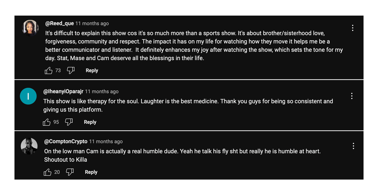 Less than two years later, It Is What It Is has about 279 episodes in the can. The show ranks No. 45 in the sports podcasts category on Spotify, has 630,000 Instagram followers, and has 551,000 subscribers on YouTube, with over 80 million views. The concept is genius and took flight. Along with a sweet payday for those involved came a huge following where thousands of supporters stay saluting the triumvirate and giving Cam’ron his flowers. A glance beneath a given episode post will show subscribers of the network leaving endearing comments: