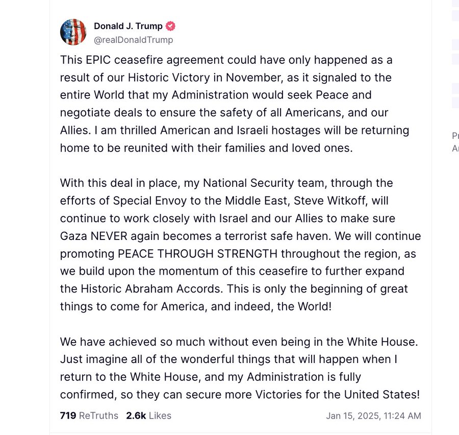 “This EPIC ceasefire agreement could have only happened as a result of our Historic Victory in November, as it signaled to the entire World that my Administration would seek Peace and negotiate deals to ensure the safety of all Americans and our Allies,” he wrote in a Truth Social post.
