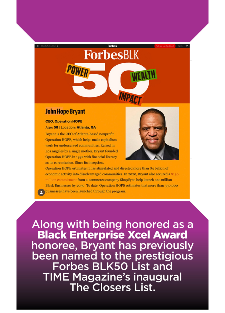 As a best-selling author, Bryant is one of the few Black thought leaders globally writing on economics and business leadership, with six books to his name, including “Financial Literacy for All” (2024). He serves as a CNBC contributor, hosts the iHeart Radio podcast “Money & Wealth with John Hope Bryant,” and is a member of both the CNBC Global Financial Wellness Council and the CNBC CEO Council. Referred to as the “Conscience of Capitalism” by Fortune 500 CEOs, Bryant’s advocacy was instrumental in making financial literacy official U.S. federal policy under Presidents George W. Bush and Barack Obama.