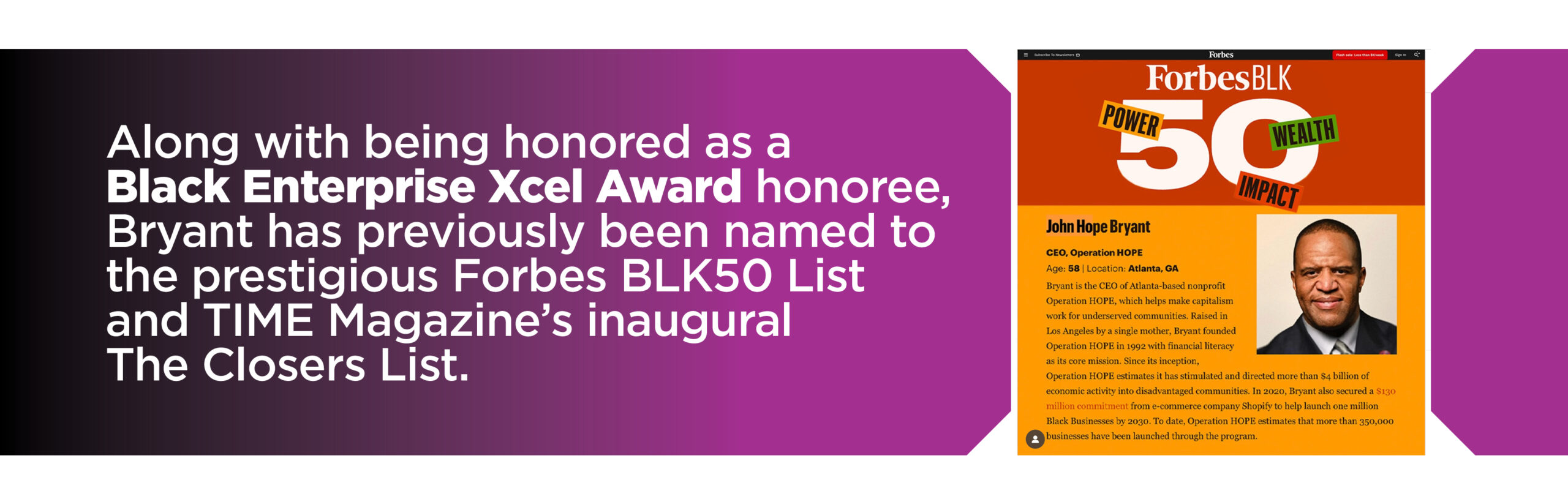 Bryant’s life mission, supported by long-time mentor and friend Andrew Young, who serves as Global Spokesman for Operation HOPE, is to help America live up to its promise—one financially and technologically empowered person at a time.