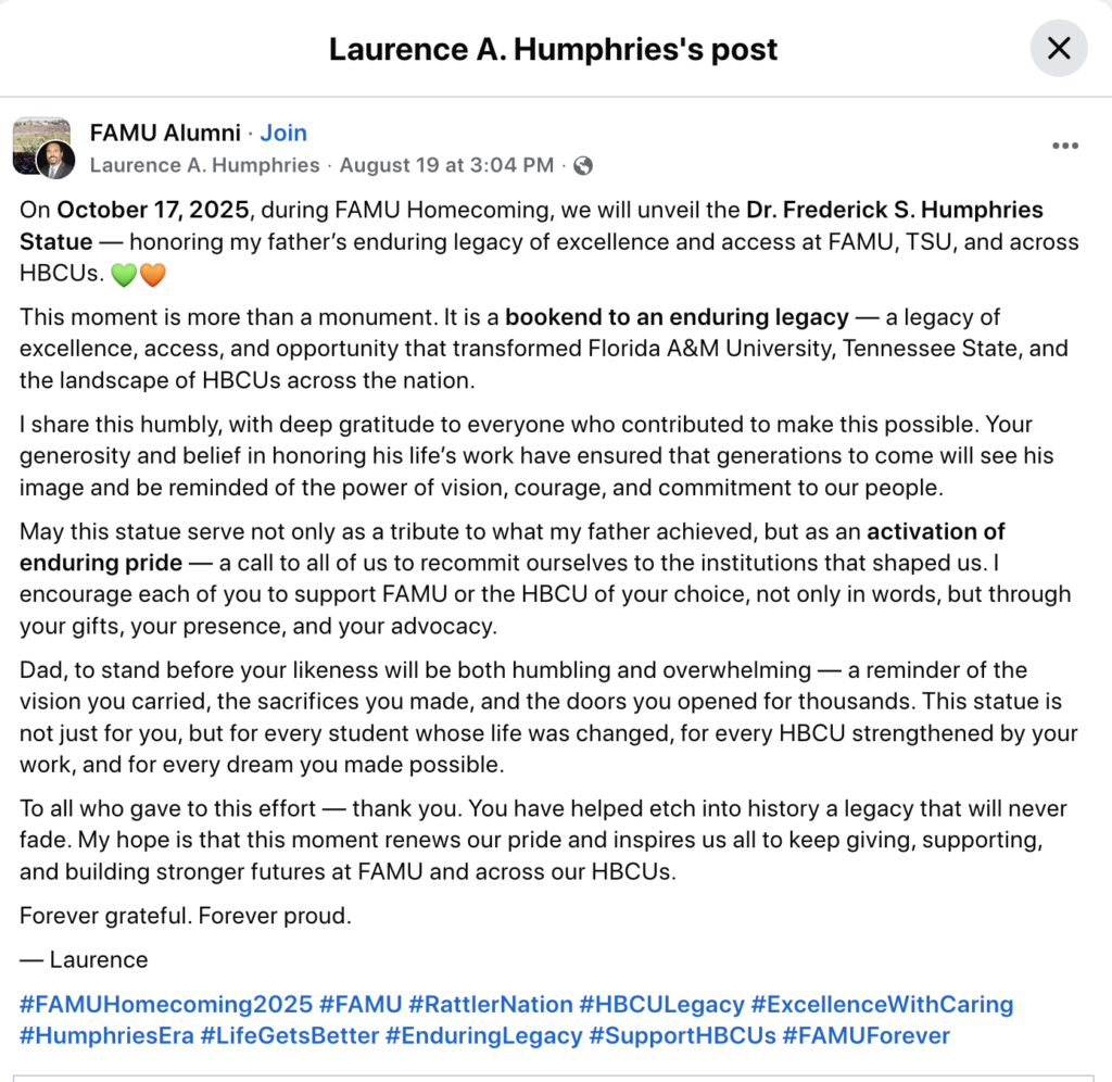 “May this statue serve not only as a tribute to what my father achieved, but as an activation of enduring pride — a call to all of us to recommit ourselves to the institutions that shaped us. I encourage each of you to support FAMU or the HBCU of your choice, not only in words, but through your gifts, your presence, and your advocacy,” he wrote.