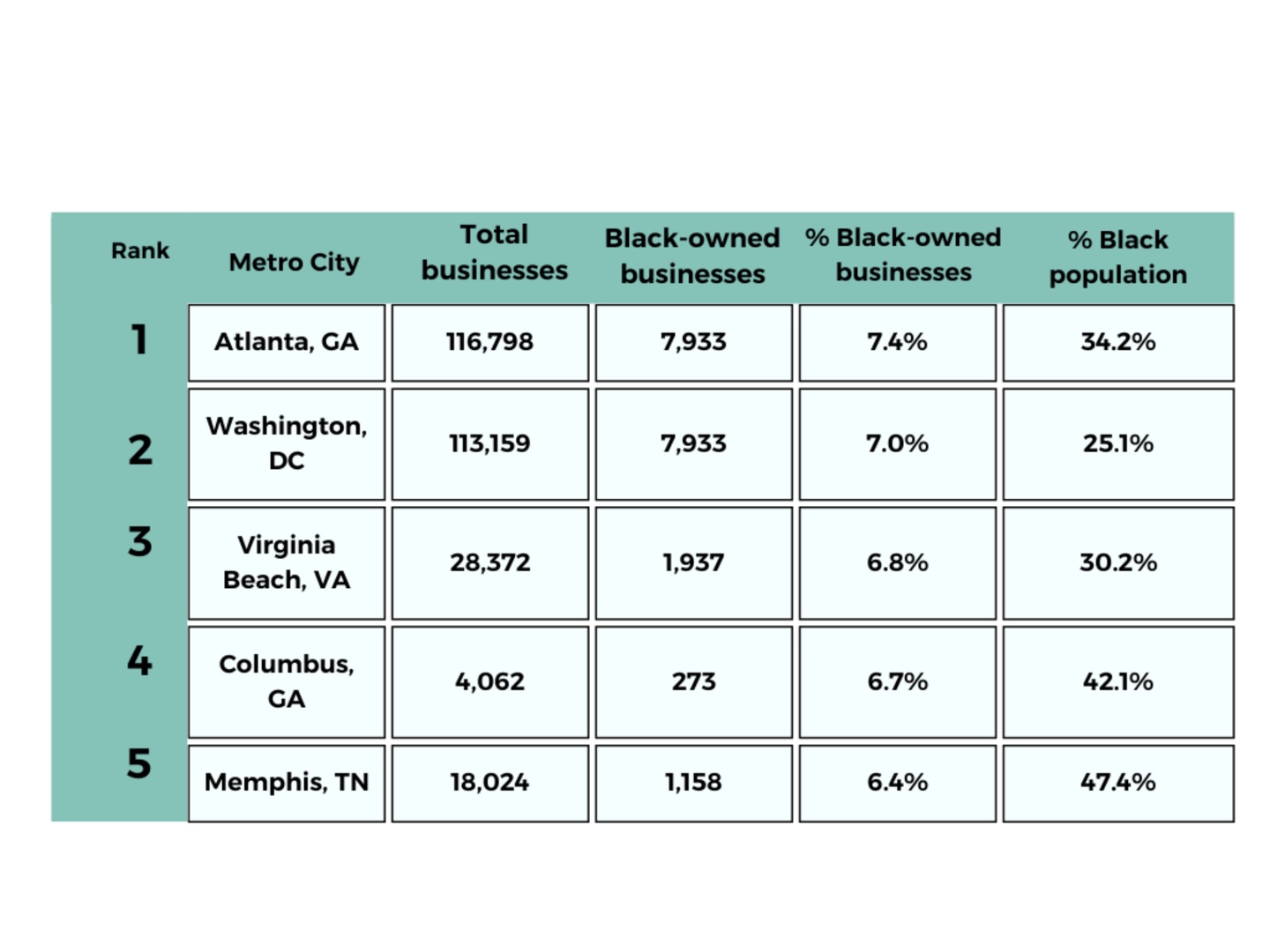 From Buckhead to Midtown, Atlanta ranks “peachy keen” with the highest % of Black-owned businesses at 7.4%. This is partly possible because of the multitude of programs and initiatives to support Black-owned businesses, including the Atlanta Business League, which provides resources and support to Black entrepreneurs, following “Hotlanta,” Washington, D.C. (7.0%), and Virginia Beach (6.8%).