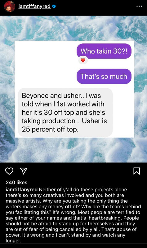 In a since-deleted post, Red shared a text message screenshot where one songwriter accused Beyoncé and Usher of taking between 25% to 30% of publishing despite not writing a song.